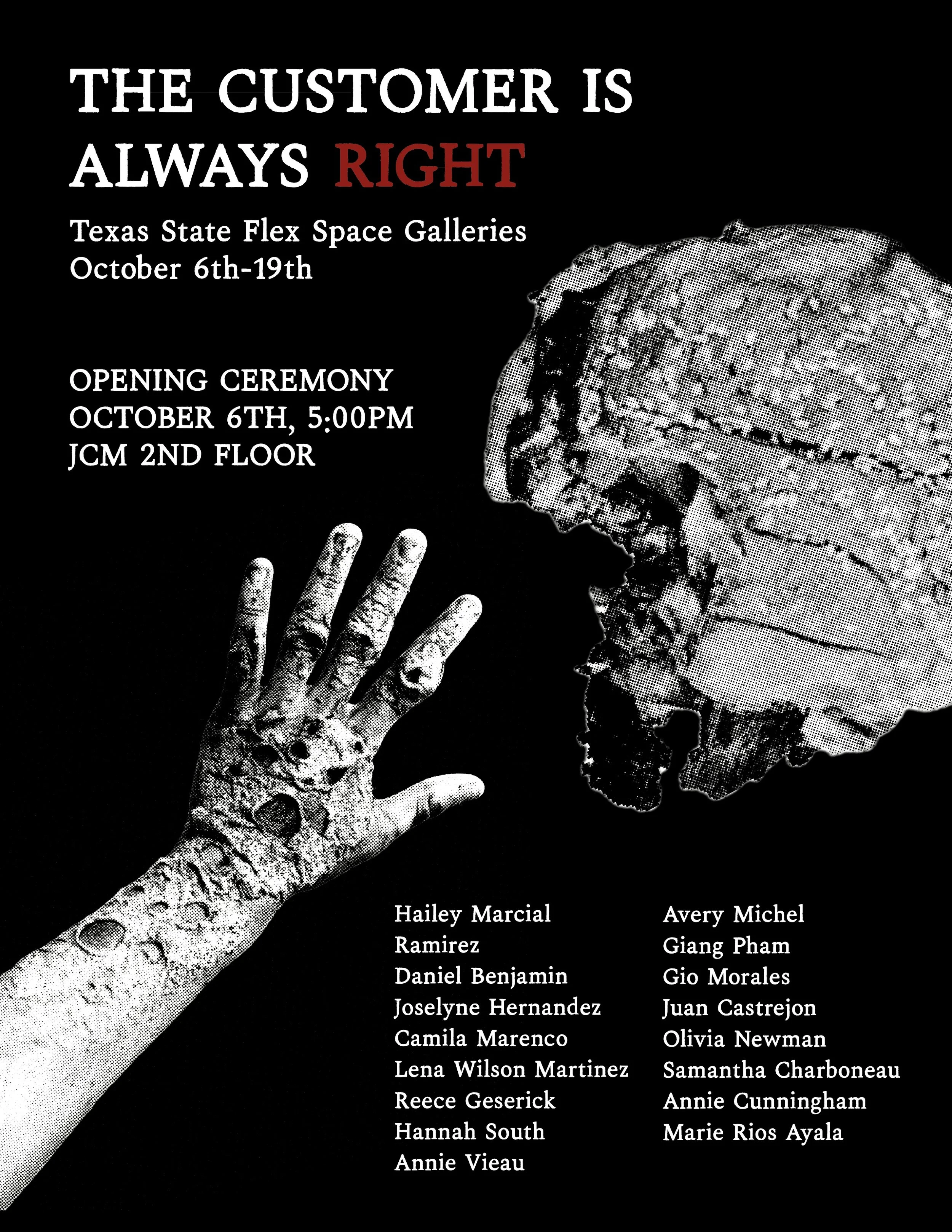 The Texas State Galleries’ FLEX space invites Texas State Art and Design students, faculty, staff, and alumni to envision and assemble well-considered, visually engaging, and conceptually stimulating exhibitions and events. Through these programs, FLEX highlights the unique creative vision of our community and its relevance within the larger art world. For details regarding the application process, including application deadlines, see Opportunities.