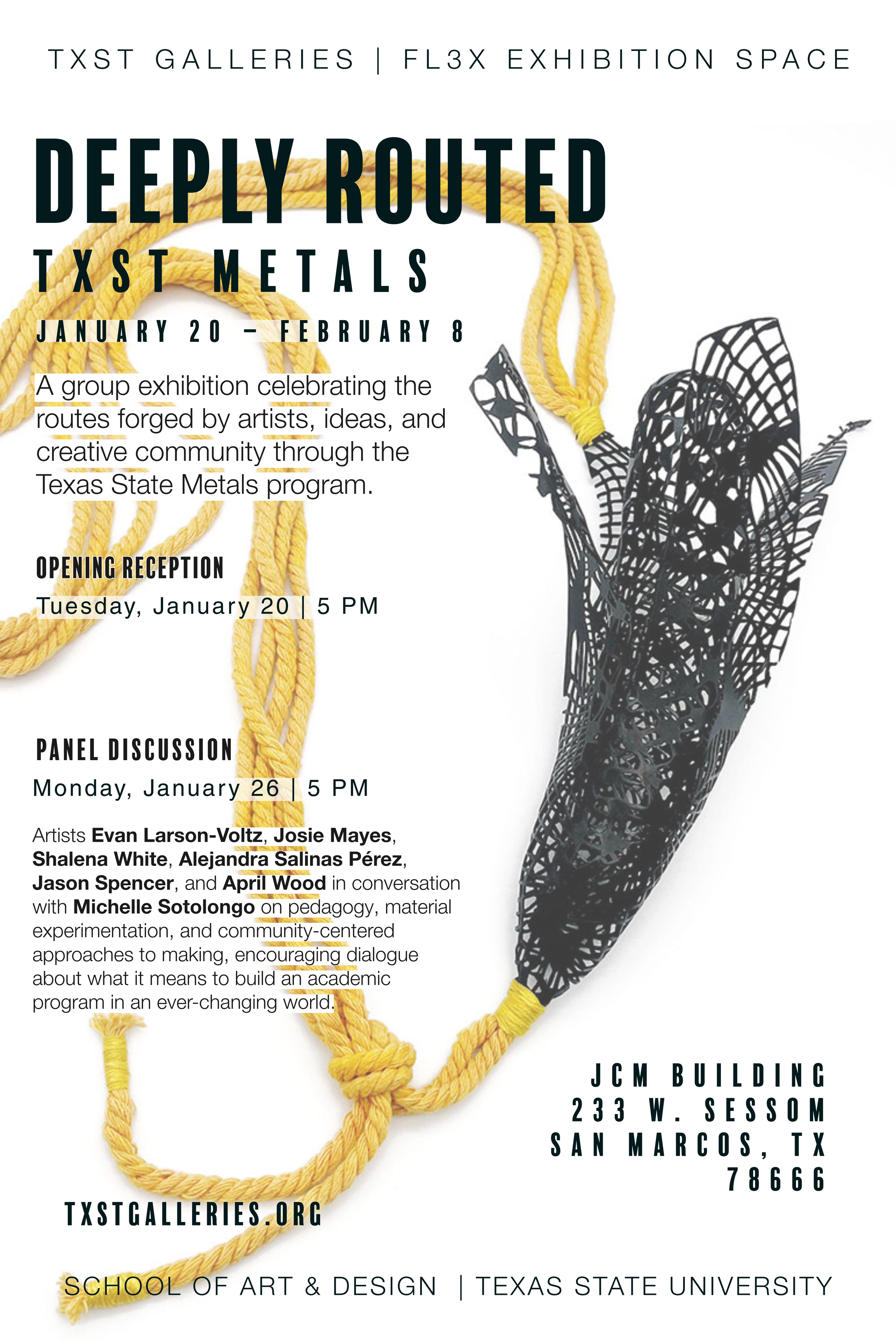 The Texas State Galleries’ FL3X space invites Texas State Art and Design students, faculty, staff, and alumni to envision and assemble well-considered, visually engaging, and conceptually stimulating exhibitions and events. Through these programs, FL3X highlights the unique creative vision of our community and its relevance within the larger art world. For details regarding the application process, including application deadlines, see Opportunities.