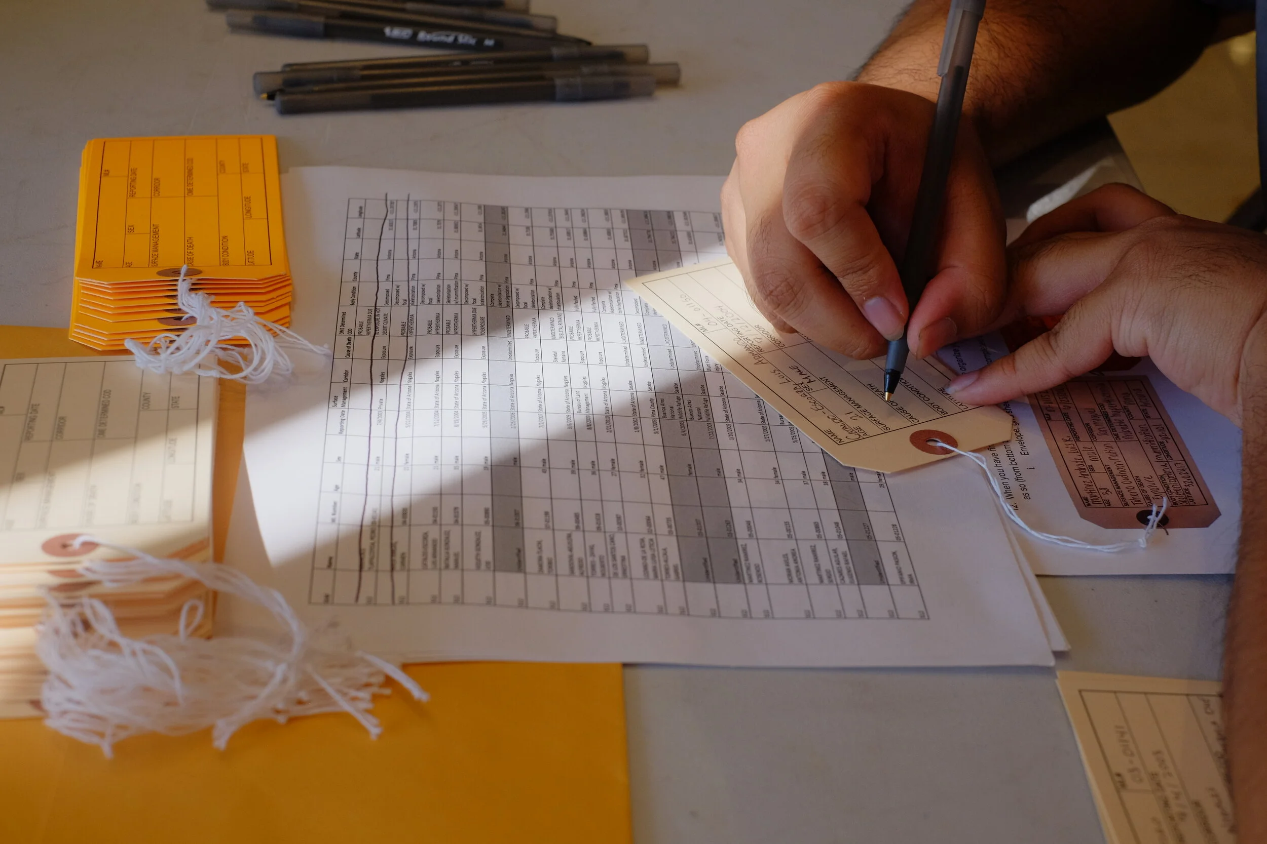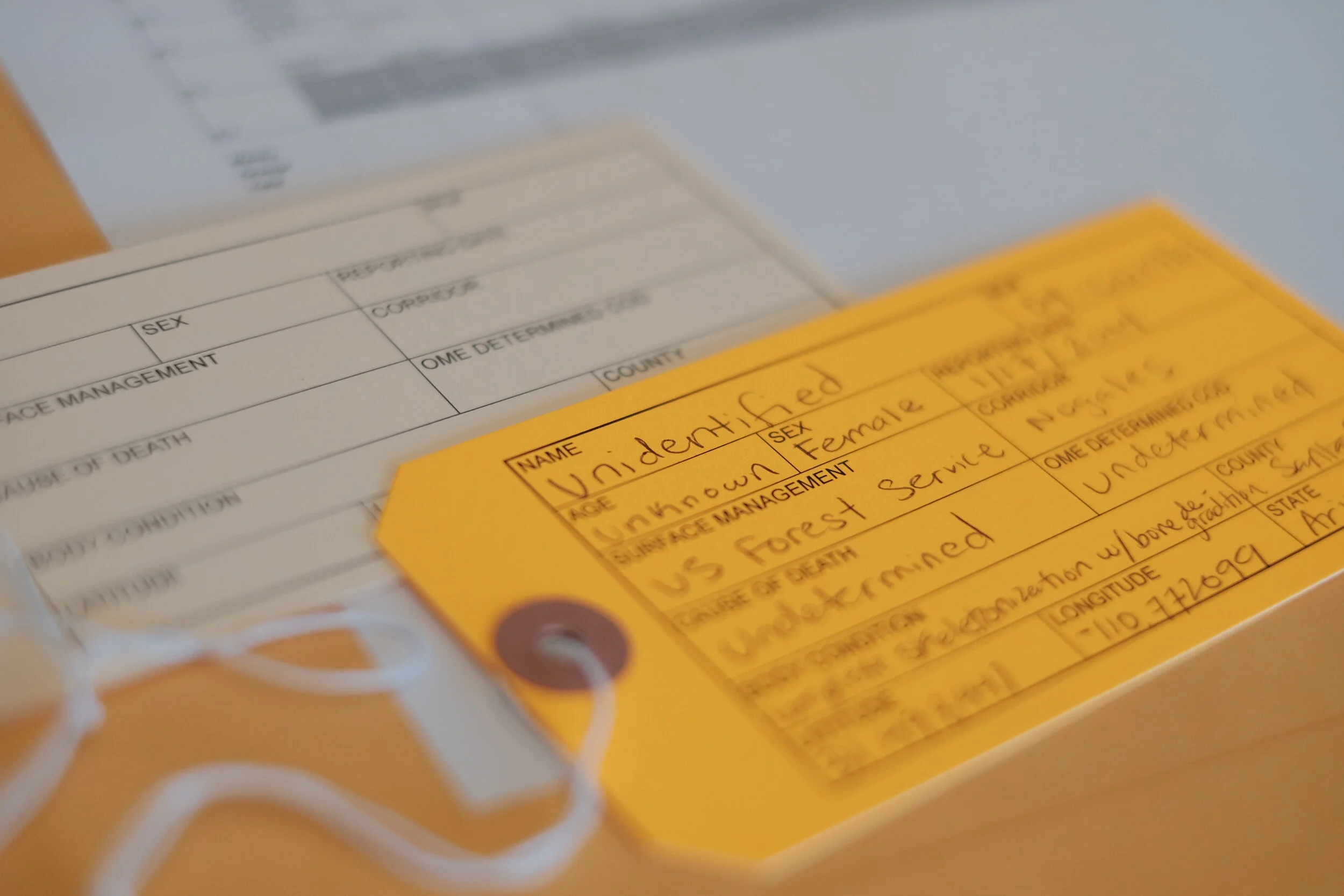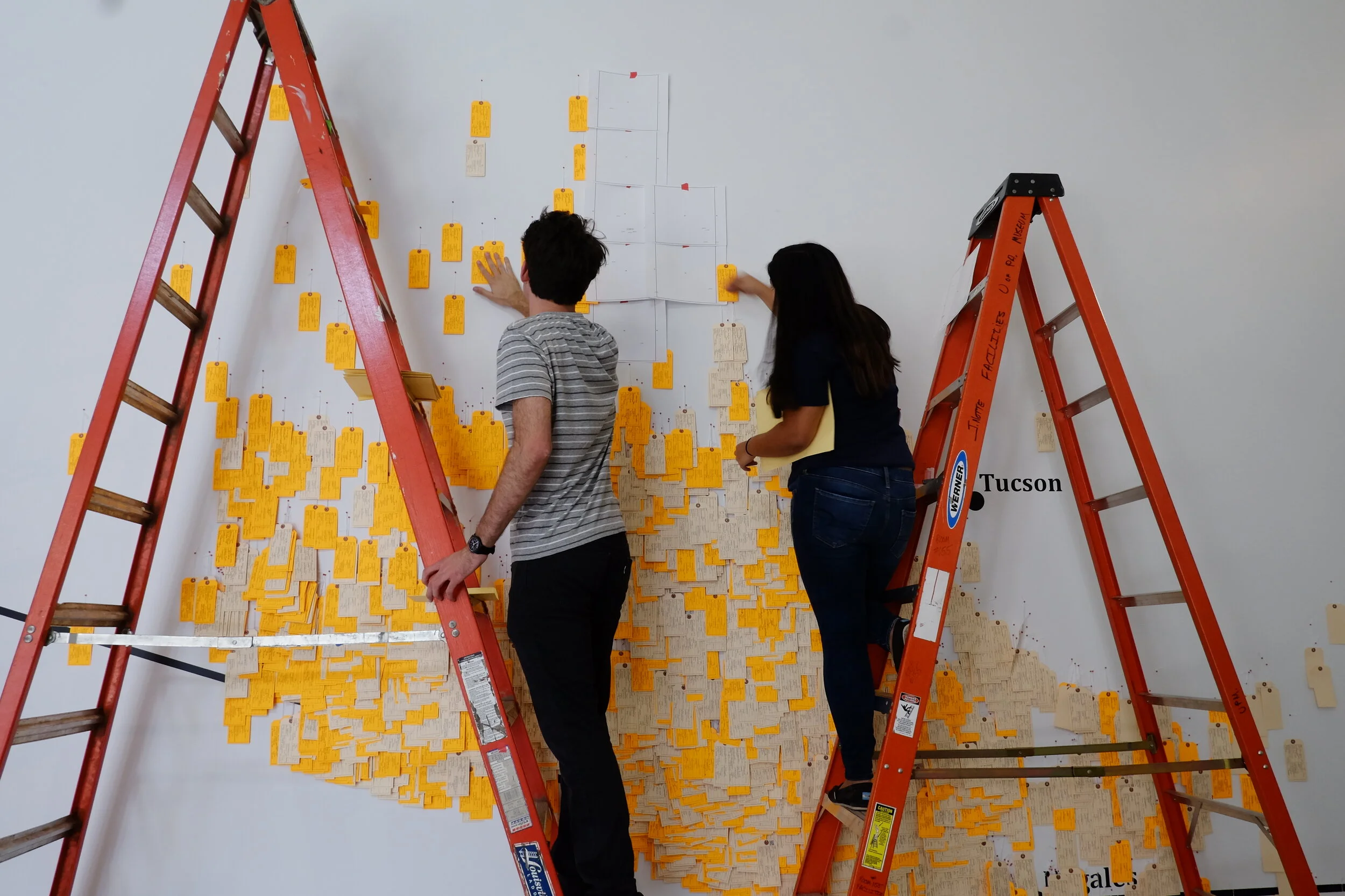 The centerpiece of the Hostile Terrain 94 exhibition is an enlarged map composed of approximately 3,200 toe tags representing people who have died while crossing a particular stretch of the U.S.-Mexico border between the mid-1990s and 2020. The construction of this memorial at Texas State Galleries is realized with the help of local volunteers invited to participate in the making of these tags, which are later installed on the map in the exact locations where the individuals’ remains were found.